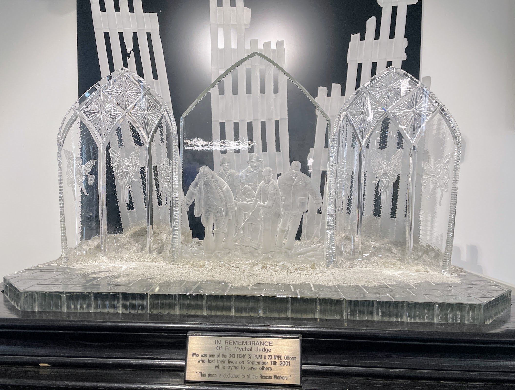 On the tour we saw a large engraved glass image of Fr Michael Judge, New York City Fire Department’s Chaplain, being carried out of the rubble of the World Trade Centre. We learned the piece was a passion project that took over 200 hours to complete.