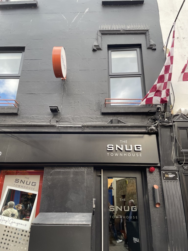 Photos – Two old time buildings serving new time food. Snug Townhouse in the Latin Quarters, Galway where the bed takes up the whole room and the scene out the window is the busy pub that rocks until 2 in the morning. A photo sample of clean busy street 🙂